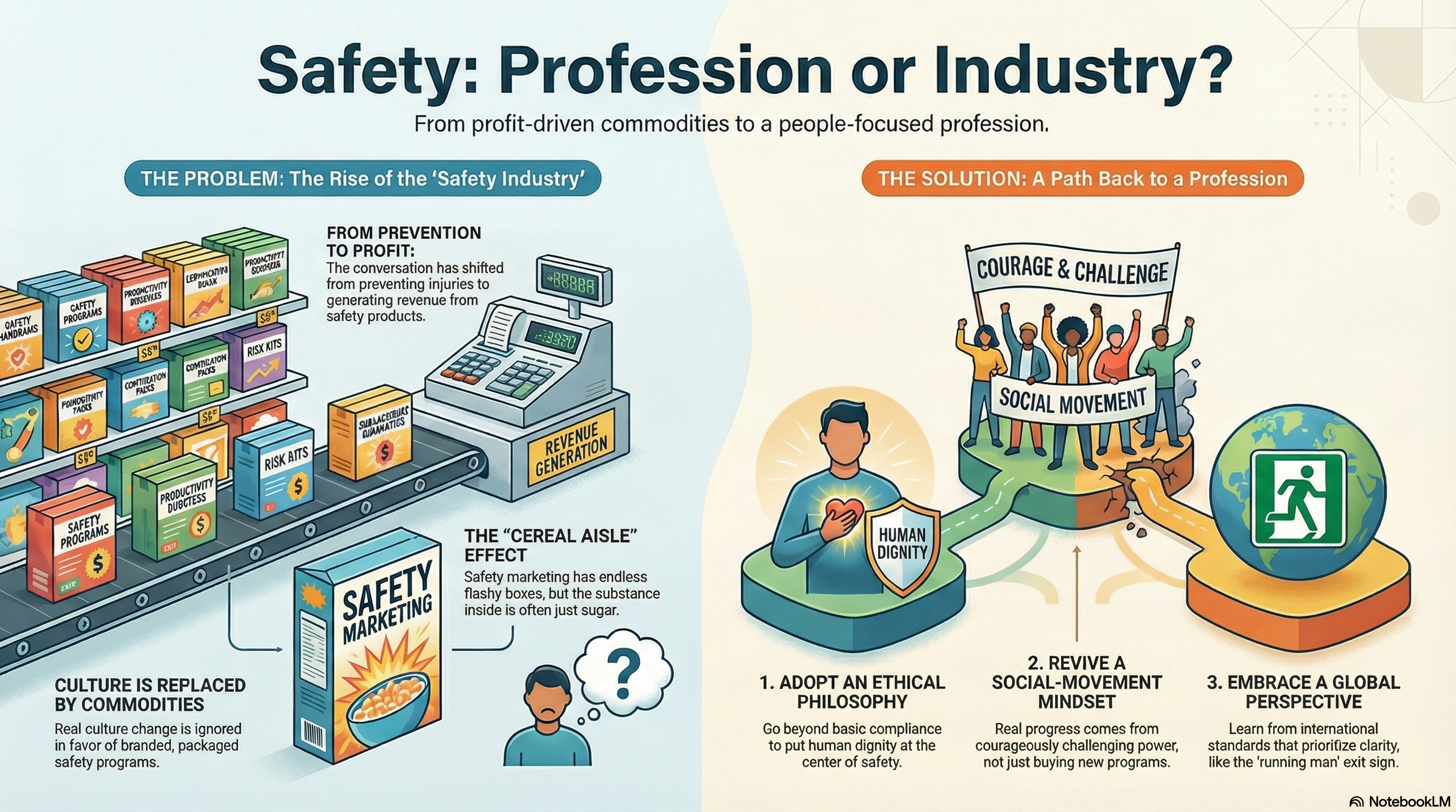 When I think about today’s safety “industry,” the image that comes to mind is standing in the cereal aisle: endless boxes with loud claims and bright branding, but inside is just sugar. There is a lot of marketing, but not always much substance. There is also too much money at stake to expect the industry, on its own, to revert to a profession grounded in ethics, courage, and worker wellbeing. For people starting their careers now, the commercialization of safety may feel normal, even inevitable.